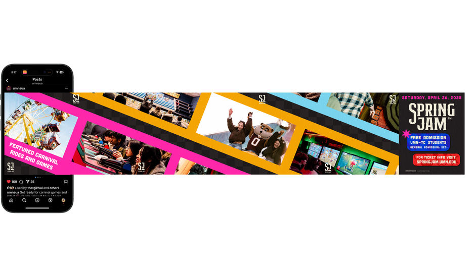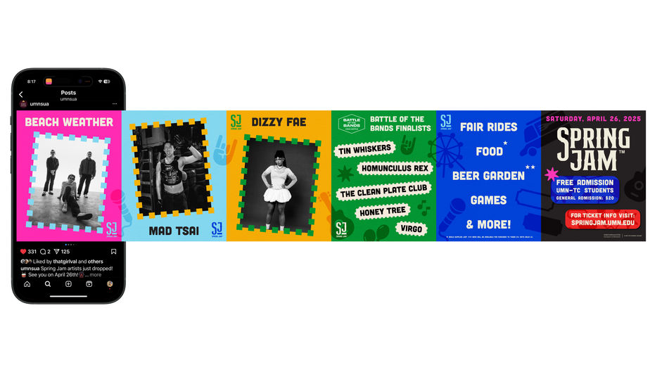 Spring Jam is one of the biggest annual student events at the University of Minnesota. An all-day music and arts festival that brings together students and friends to celebrate the end of the academic year. For 2025, I served as the sole lead designer, responsible for building a complete visual world around this high-energy, community-driven event.